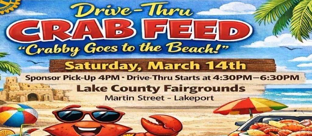 Lakeport Rotary is back with its 6th Annual Drive-Thru Crab Feed—and it’s a can’t-miss good time! Join us March 14 at the Lake County Fairgrounds on Martin Street in Lakeport. Tickets purchased beforehand and available at the link below: