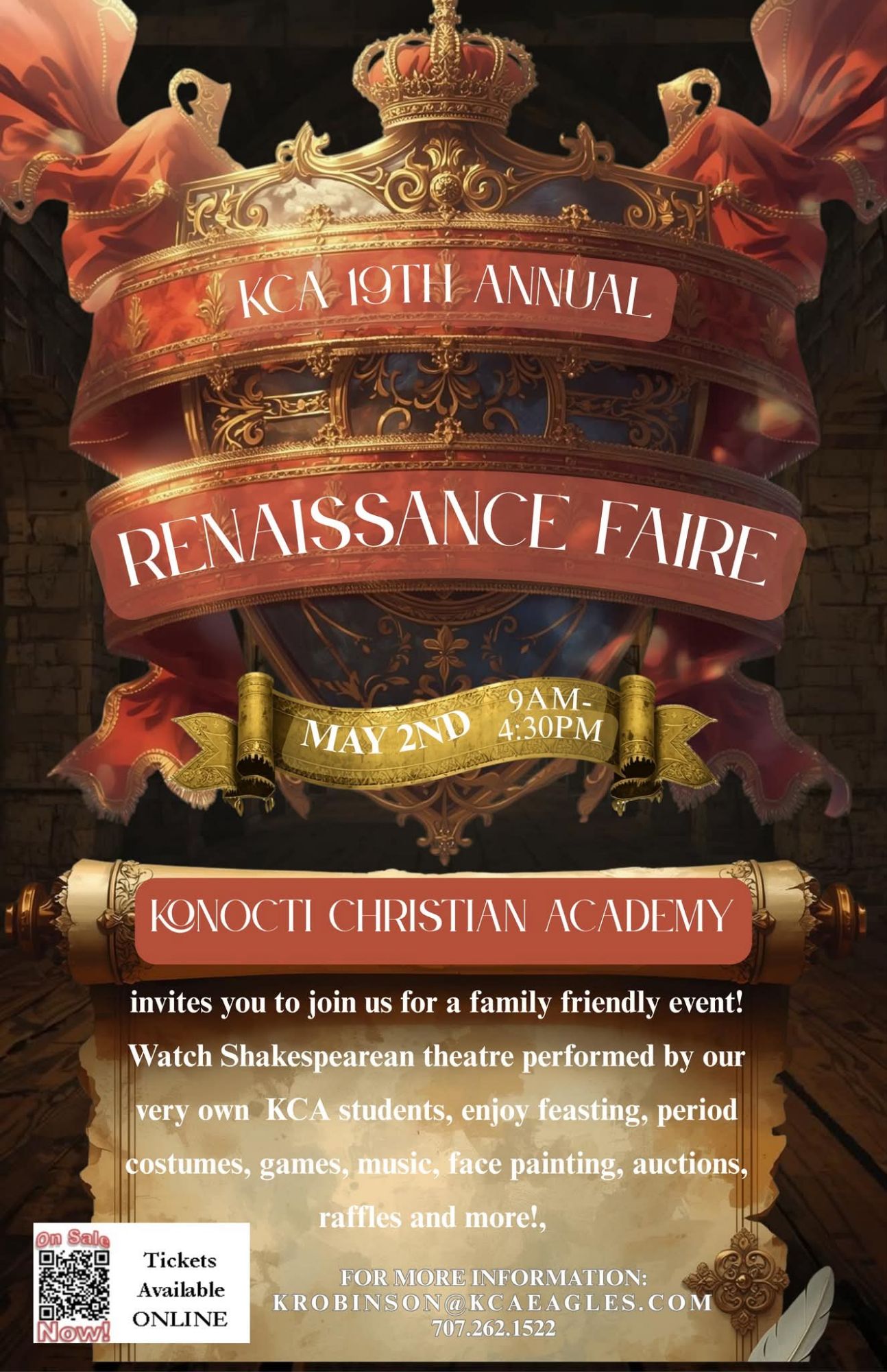 Konocti Christian Academy invites you to join us for a family-friendly event! Watch Shakespearean theatre performed by our very own KCA students, enjoy feasting, period costumes, games, music, face painting, auctions, raffles, and more!