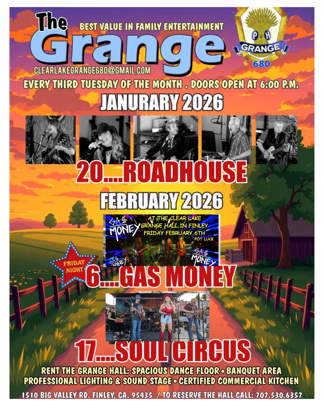 Soul Circus at the Clear Lake Grange February 17 @ 6:00 PM - 10:00 PM Clear Lake Grange 1510 Big Valley Road, Finley, CA, United States Potluck! Doors open at 6 pm. Come and dance!